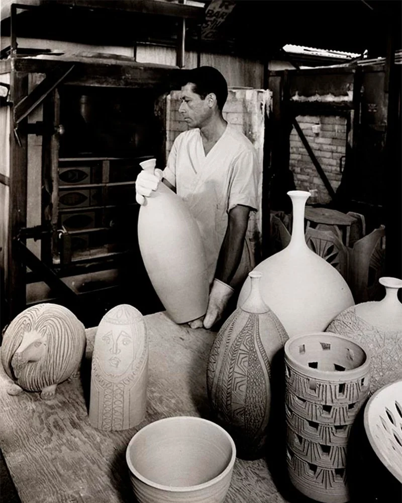 Moving back to California, he honed his ceramics skills at LA State and USC, and was also said to have studied at Pond Farm. During that time Leonore worked as a dental hygienist and he did teaching jobs, all the while saving money to open a studio of his own.